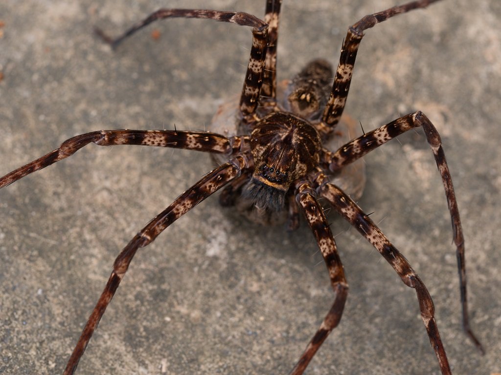 Heteropoda sp. „Golden Brown“ je impozantní pavouk z čeledi Sparassidae, známý také jako „lovec na stěnách“ díky své rychlosti a obratnosti. Tělo je štíhlé a zploštělé, zbarvení je teplé hnědé až zlatavé s jemnými kontrastními vzory, což mu umožňuje splynout s podkladem. Nohy jsou dlouhé a silné, opatřené chloupky pro lepší uchopení povrchů, což pavoukovi umožňuje bleskově pronásledovat kořist. Tento druh je aktivní lovec, který nepoužívá pavučiny, místo toho se pohybuje po rostlinách, stěnách nebo v teráriu a přímo chytá hmyz.