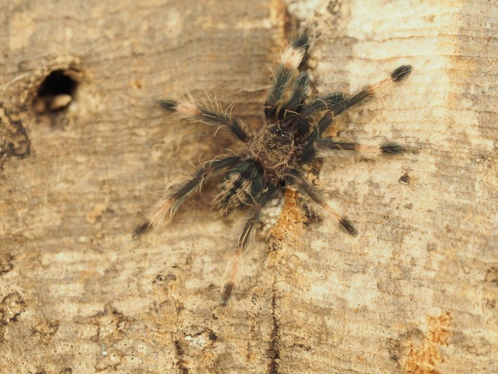 Popis: Psalmopoeus cambridgei je stromový sklípkan z čeledi Theraphosidae pocházející z Karibiku. Patří mezi elegantní a rychlé druhy s velmi atraktivním zbarvením. Základní barva těla je hnědá až olivově zelená, často s jemným kovovým nádechem. Na koncích nohou má oranžové plamínky.